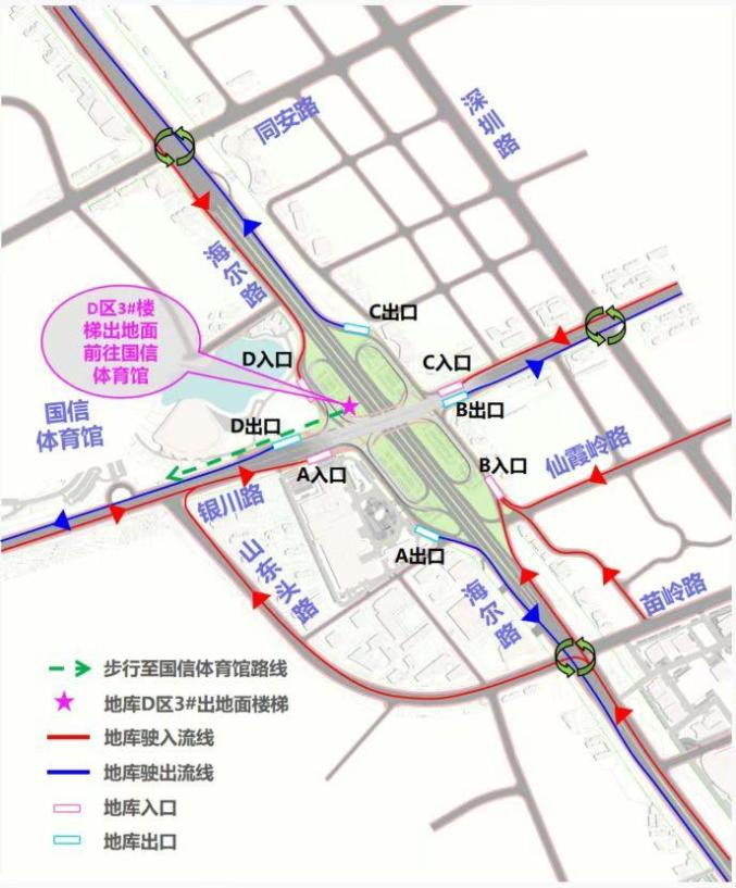 停車場(chǎng)位置:金家?guī)X地下停車場(chǎng)位于海爾路與銀川路交匯處,從該停車場(chǎng)D區(qū)3# 樓梯出地面后,步行約600米就能到達(dá)青島國(guó)信體育中心。