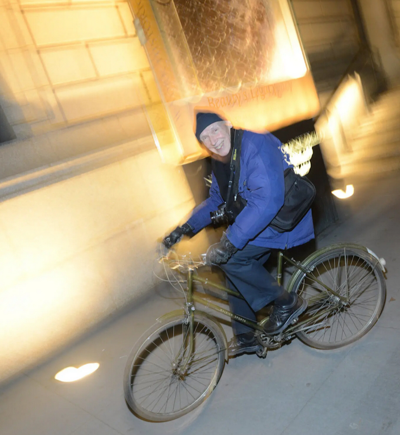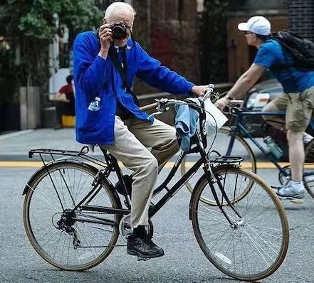 2014年,比爾身著標(biāo)志性藍(lán)色夾克,騎著自行車,脖子上掛著相機(jī)