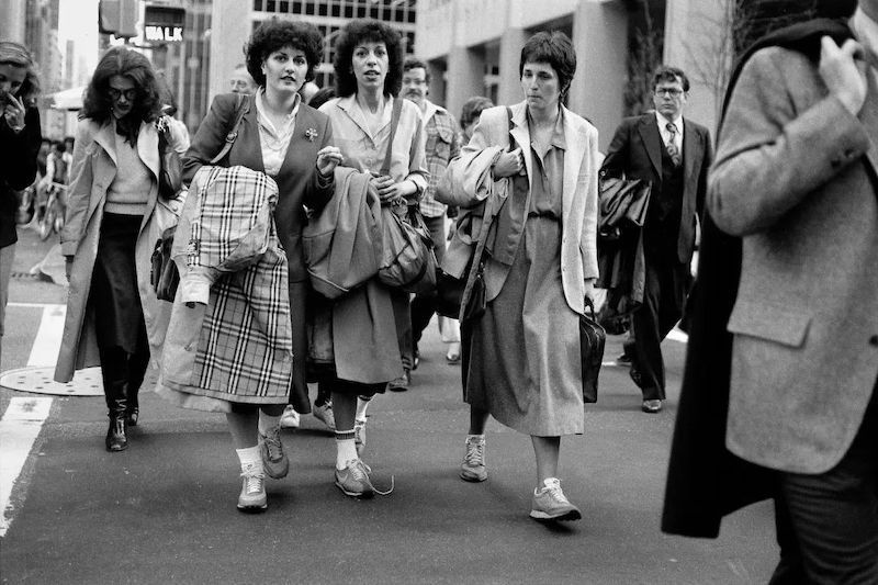 1980年交通罷工期間,女性穿著運(yùn)動(dòng)鞋步行上班,比爾·坎寧安拍攝