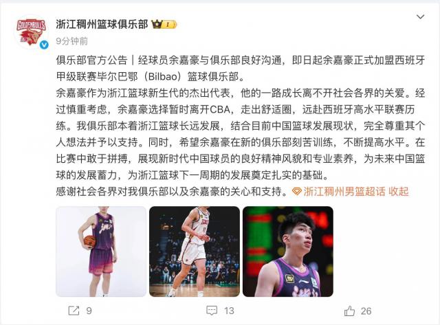 目前,球員正隨中國(guó)男籃備戰(zhàn)沙特亞洲杯,待賽事結(jié)束后,他將奔赴西班牙報(bào)到。