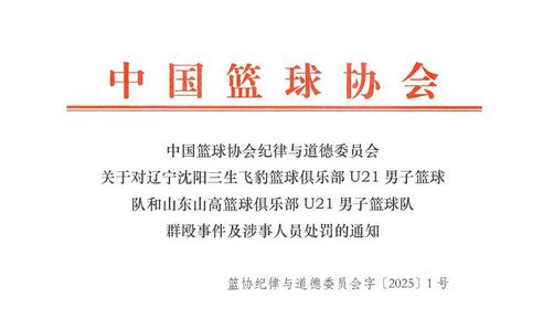 昨日,中國(guó)籃球協(xié)會(huì)官網(wǎng)發(fā)布通報(bào),針對(duì)全國(guó)U21青年籃球錦標(biāo)賽中的運(yùn)動(dòng)員群毆事件開(kāi)出處罰通知。黃秋實(shí)、張峻豪(遼寧)、袁帥、崔嘉航(山東)4人被取消2025年U21錦標(biāo)賽比賽資格,并且停賽三年。