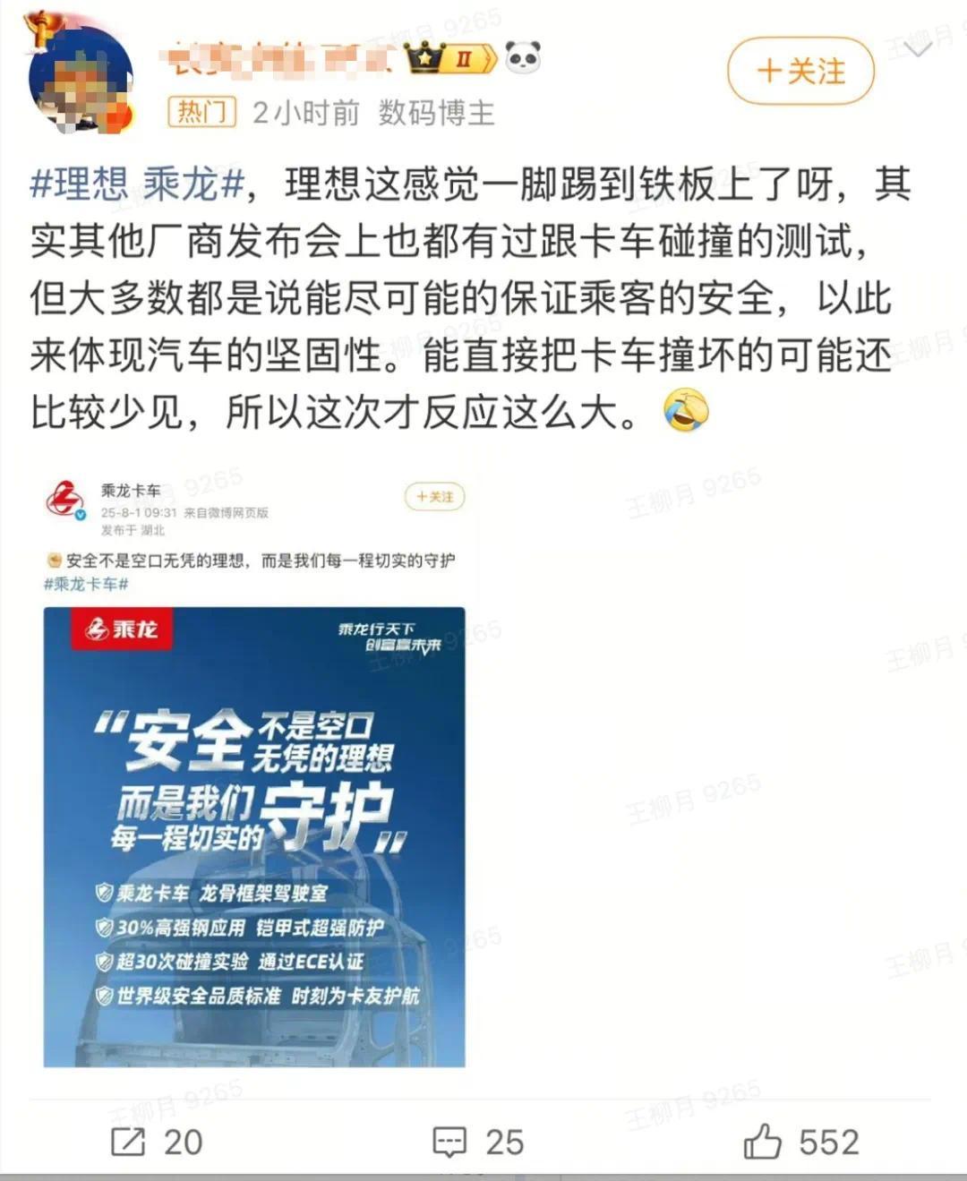 有網(wǎng)友認(rèn)為,其他車企也會(huì)跟卡車進(jìn)行碰撞測(cè)試,但直接把卡車撞壞的情況卻比較少見(jiàn),“理想這感覺(jué)一腳踢到鐵板上了”。