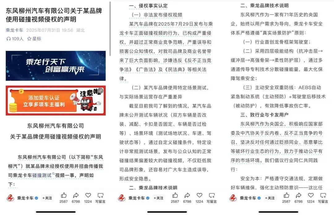 乘龍卡車在微信官號(hào)“乘龍卡車”發(fā)布聲明,稱理想發(fā)布正面碰撞視頻的行為“已構(gòu)成嚴(yán)重侵權(quán),并超過(guò)正常商業(yè)競(jìng)爭(zhēng)范疇,嚴(yán)重誤導(dǎo)和損害公眾知情權(quán),對(duì)我司品牌及商業(yè)名譽(yù)帶來(lái)了巨大負(fù)面影響”。