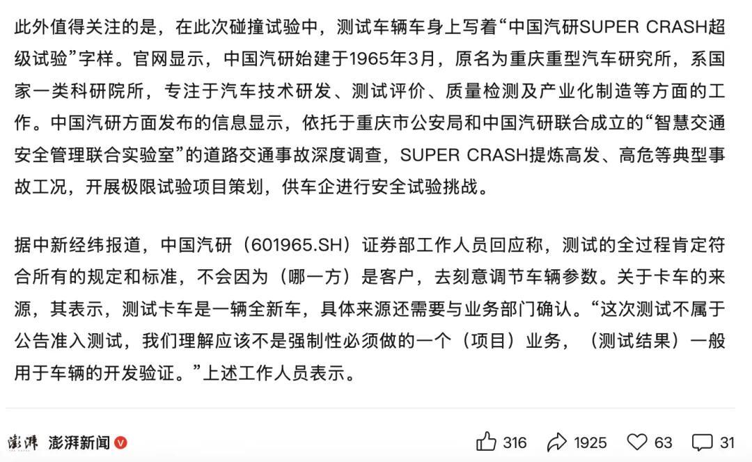 此測(cè)試視頻引發(fā)部分網(wǎng)友對(duì)被撞卡車質(zhì)量的質(zhì)疑??ㄜ囁鶎倨放品匠她埧ㄜ嚬俜蕉兑艋貞?yīng)稱,法務(wù)部門正在處理,并且明確質(zhì)疑了測(cè)試結(jié)果的真實(shí)性。