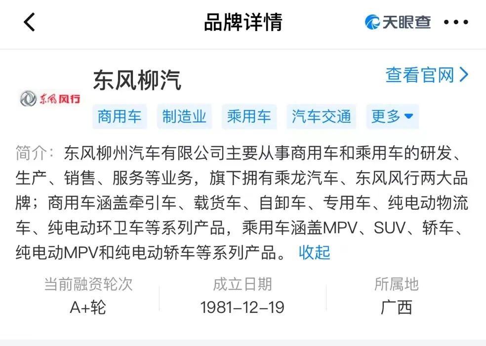 天眼查官網(wǎng)顯示,乘龍汽車隸屬于“東風(fēng)柳汽有限公司”,旗下有乘龍汽車、東風(fēng)風(fēng)行兩大品牌。