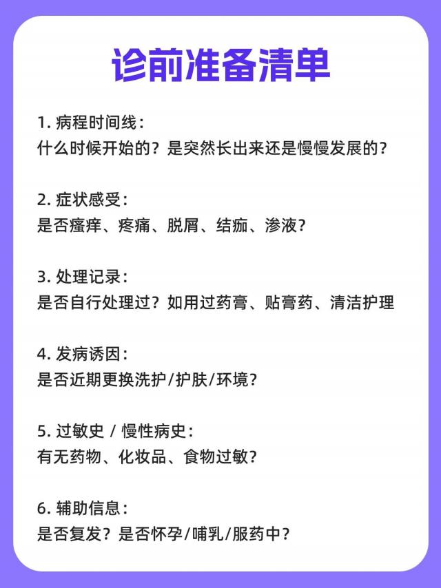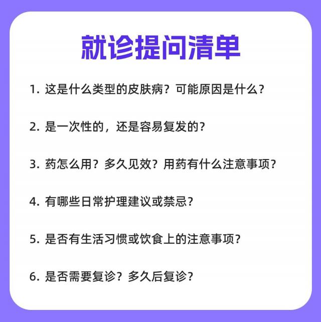 如果你一到就診就忘記要問什么,可以參考下面這份皮膚科就診提問清單,選取自己關(guān)心的問題提問。
