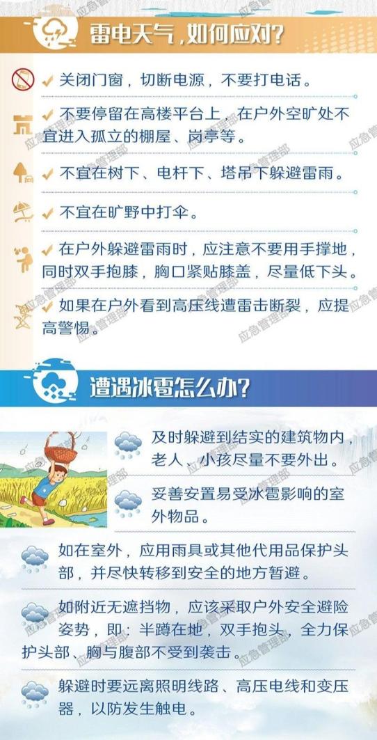 如遇雷電天氣,不要在山頂或高丘地帶停留;不要躲在避雷針和大樹下;在空曠處不要打傘、接打電話;在室內(nèi)要關(guān)好門窗,防止雷電直擊和球形雷飄入,拔掉電源、電話線等,遠(yuǎn)離進(jìn)戶金屬水管。