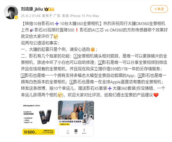 此外,影石CEO劉靖康專門發(fā)了一條微博,熱烈祝賀同行大疆OM360全景相機(jī)上市。