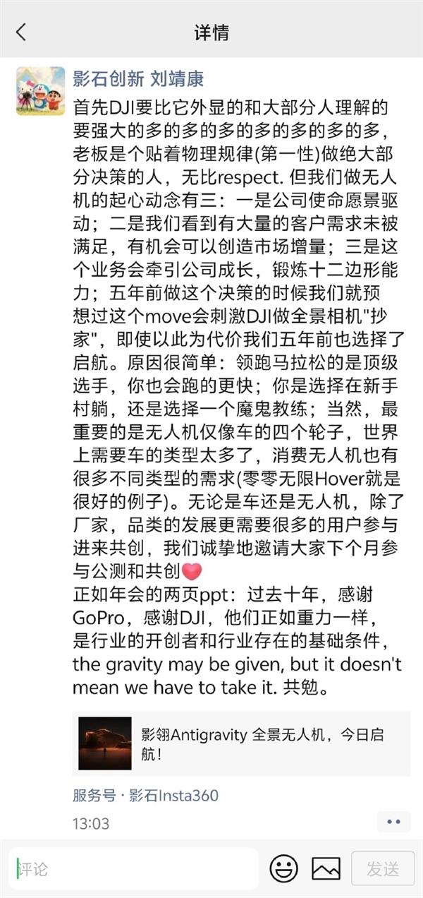 對于進(jìn)軍無人機(jī)領(lǐng)域,劉靖康曾發(fā)朋友圈表示做無人機(jī)的起心動念有三個,并且稱無比尊重大疆。
