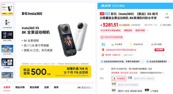 影石迅速對這個新對手表示了“歡迎”,Insta360 X5新品首次降價500元,到手價3298元起。