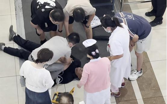 患者心臟驟停倒地,命懸一線。哈爾濱的孫大爺(化名)因胸口悶痛來(lái)哈爾濱市第一醫(yī)院就診,剛走過(guò)門(mén)診安檢口,意外發(fā)生了。孫大爺突然面色驟變,身體一軟,重重栽倒在地,面色青紫、意識(shí)喪失,呼吸與脈搏全無(wú)。