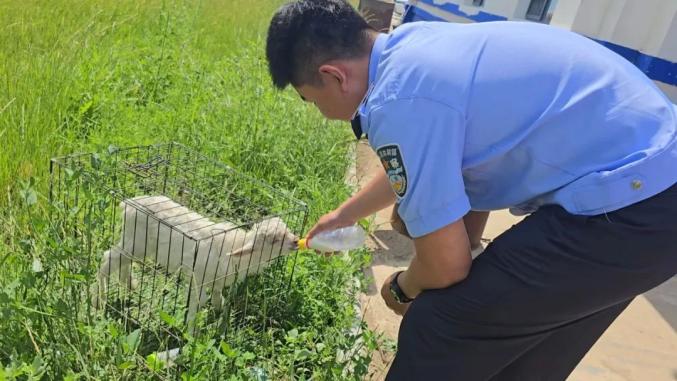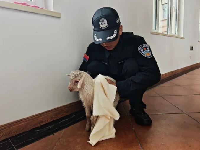 因找不到羊群,隊員們將小羊抱回辦公室,用干毛巾擦干雨水,調(diào)制溫牛奶喂食。起初小羊膽怯,后來大口吮吸,小尾巴翹起。小羊在隊員搭建的紙箱窩里安頓下來。