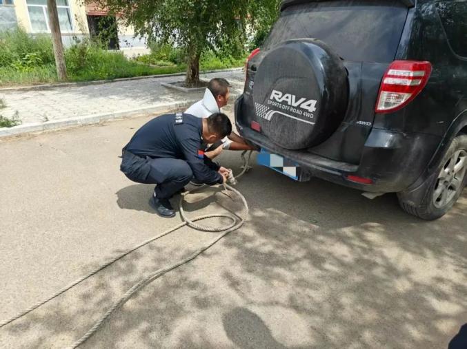 原來,這是自駕游游客,后車故障,前車拖拽時拖車?yán)K斷裂。當(dāng)時車流量漸大,車輛停在路中很危險且影響通行。隊員們放棄午飯,回派出所取來拖車?yán)K,將故障車拖至路邊,并引導(dǎo)前往修理部。