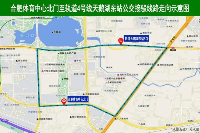 軌道4號(hào)線天鵝湖東站公交接駁線從體育中心北門(mén)“合肥體育中心”公交站發(fā)車(chē),途經(jīng)習(xí)友路~金寨路~祁門(mén)路~懷寧路~習(xí)友路~體育中心北門(mén),在軌道4號(hào)線天鵝湖東站A口落客。