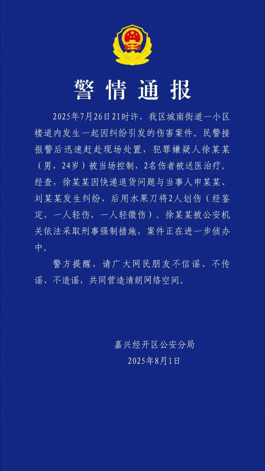 8月1日晚,浙江嘉興經(jīng)開(kāi)區(qū)公安分局發(fā)布警情通報(bào):2025年7月26日21時(shí)左右,在該區(qū)城南街道一小區(qū)樓道內(nèi)發(fā)生了一起因糾紛引發(fā)的傷害案件。民警接到報(bào)警后迅速趕到現(xiàn)場(chǎng)進(jìn)行處置,犯罪嫌疑人徐某某(男,24歲)被當(dāng)場(chǎng)控制,2名傷者被送往醫(yī)院治療。