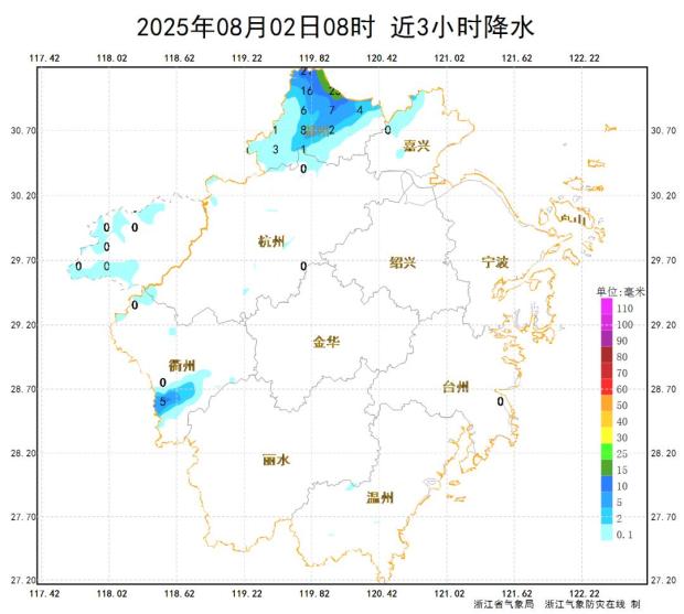 “竹節(jié)草”已于昨天23時停編,但其殘余環(huán)流還是給浙江省北部帶來了一些降水。清晨,湖州地區(qū)就遭遇了降雨,截至08時,近3小時累計(jì)降水量最大的是湖州長興東王村站,達(dá)到40.0毫米。