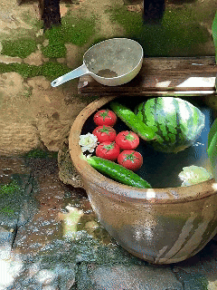 還有一個(gè)水缸,里面泡滿了西瓜、黃瓜、西紅柿。陽光照進(jìn)缸里,水紋把光揉皺又展開,就像小時(shí)候攥緊又松開的糖紙。你盯著那一波又一波的水紋發(fā)呆,覺得可以這樣呆一下午。