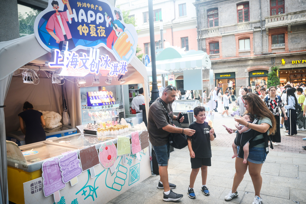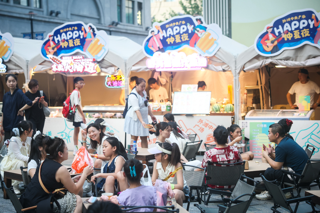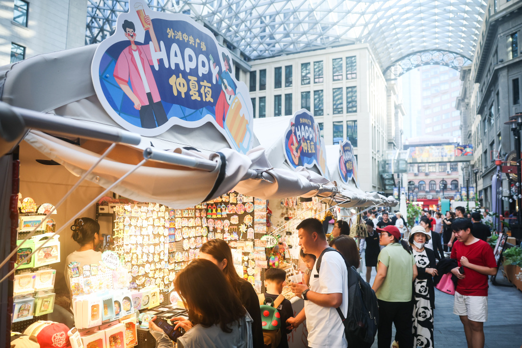 “沉浸式仲夏夜派對(duì)”集市區(qū)域,市民游客在購(gòu)物。