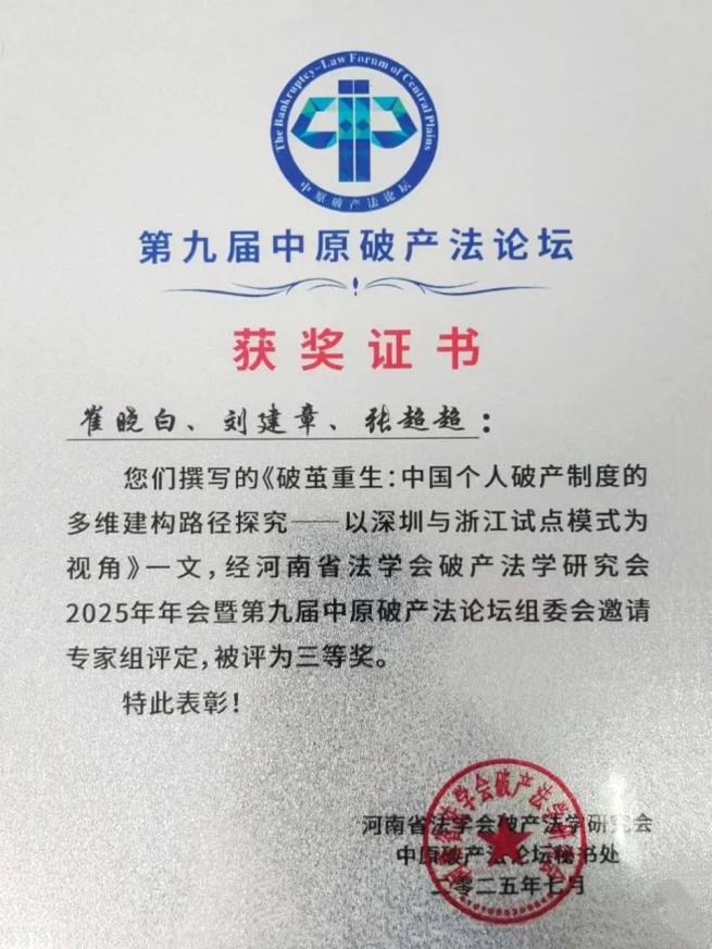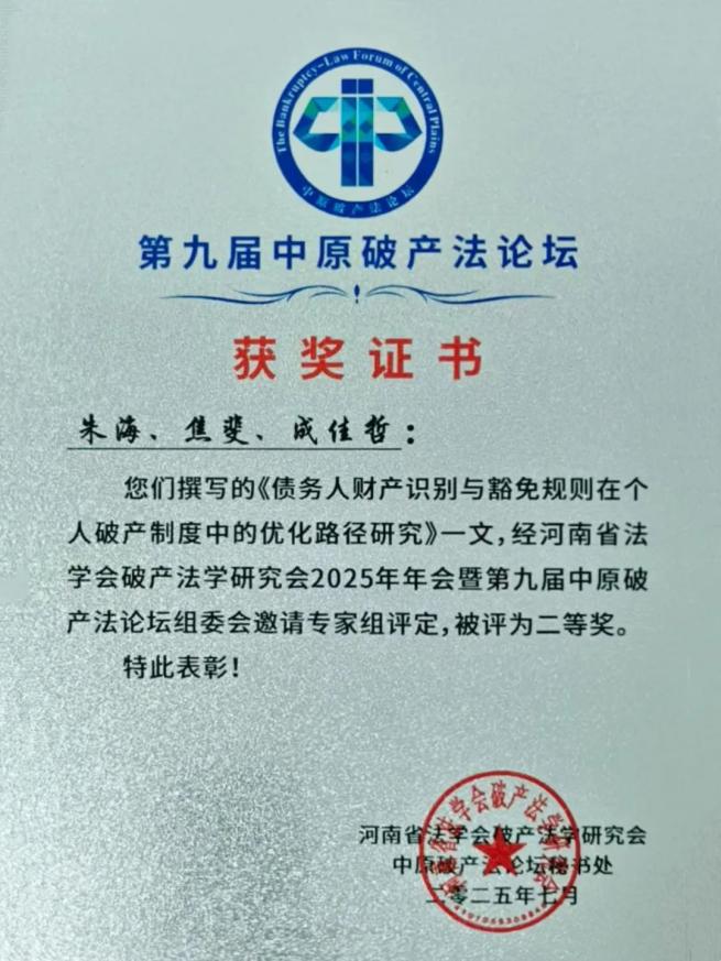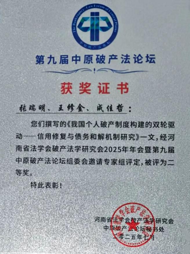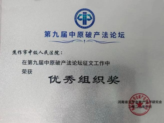 焦作中院榮獲2025年第九屆中原破產(chǎn)法論壇“優(yōu)秀組織獎”