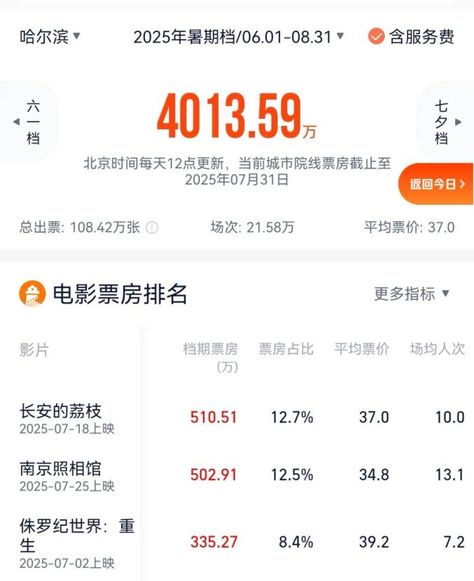 哈爾濱暑期檔票房破4000萬,已售108萬張票
