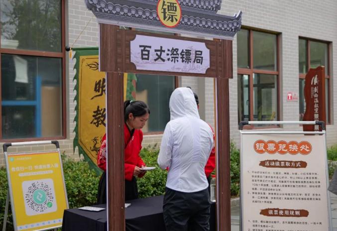 除了精彩的表演和互動,此次武俠大會還設(shè)置了豐富的沉浸式游戲體驗(yàn)。腰佩長刀、身背鏢旗的迎客鏢師會給游客發(fā)放特制“銀票”,游客憑借“銀票”可以參與騎馬、射箭、投壺、套圈、古骰子等古代游戲,真切感受“江湖俠客”的日常樂趣,過一把武俠癮。