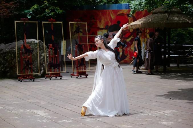 一進(jìn)入百丈漈景區(qū),仿佛穿越到了一個(gè)刀光劍影的武俠世界。黑袍俠客臨水而坐,撥動琴弦,悠揚(yáng)的古典樂在山水間回蕩。在楓情園,江湖藝人表演著驚險(xiǎn)的噴火節(jié)目,引得游客陣陣叫好。不遠(yuǎn)處,丐幫與華山派的武術(shù)對決精彩紛呈,拳腳生風(fēng),讓游客近距離感受武俠魅力。對決間隙,一襲白衣的小龍女翩翩起舞,為表演增添了柔情,贏得游客掌聲。小龍女扮演者周莉表示:“希望通過我的舞蹈讓大家感受武俠世界的激情與魅力?!?/p>