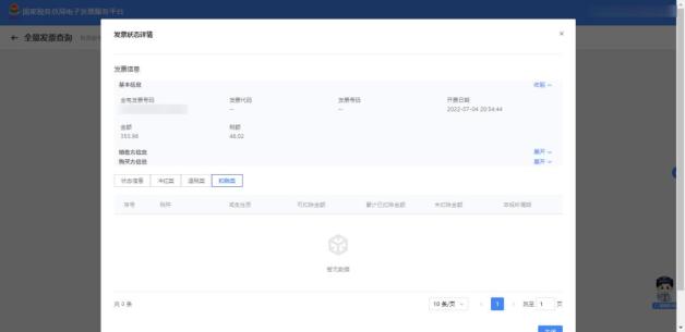 點(diǎn)擊“詳情”鏈接,系統(tǒng)根據(jù)納稅人所選擇的發(fā)票查詢?cè)搹埌l(fā)票當(dāng)前標(biāo)簽信息,默認(rèn)展示“狀態(tài)信息”標(biāo)簽頁(yè)。