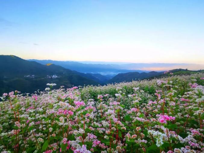 山下云霧繚繞,山上連片的蕎花在風中綻放,層層疊疊的花海隨風搖曳,宛如粉白色的波浪。游客們在花海中穿梭,拍照留念、駐足欣賞。