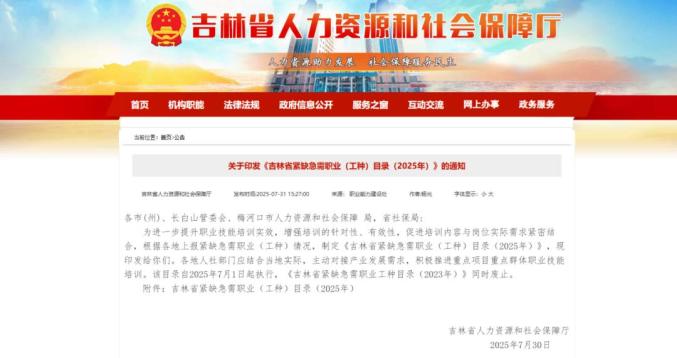為提升職業(yè)技能培訓(xùn)效果,使培訓(xùn)更具針對性和有效性,讓培訓(xùn)內(nèi)容契合崗位實(shí)際需求,依據(jù)各地上報(bào)的緊缺急需職業(yè)(工種)情況,制定了《吉林省緊缺急需職業(yè)(工種)目錄(2025年)》,現(xiàn)印發(fā)給你們。各地人社部門要結(jié)合本地實(shí)際,主動(dòng)對接產(chǎn)業(yè)發(fā)展需求,積極推動(dòng)重點(diǎn)項(xiàng)目重點(diǎn)群體的職業(yè)技能培訓(xùn)。該目錄自2025年7月1日起施行,《吉林省緊缺急需職業(yè)工種目錄(2023年)》同時(shí)廢止。