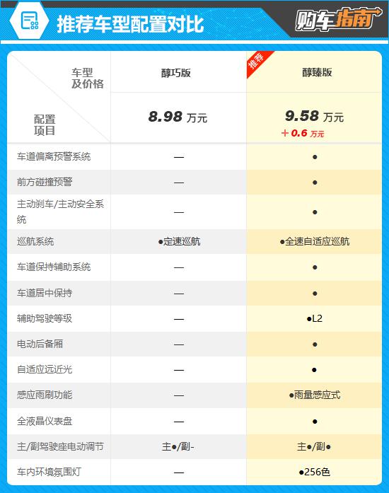售價9.58萬元的醇臻版是本次的推薦車型。通過配置對比可知,相比入門版車型,推薦車型增加了副駕駛座電動調(diào)節(jié)、自適應遠近光、電動后備廂等功能,能有效提升日常用車的便利性。此外,還增加了全速自適應巡航、車道保持輔助系統(tǒng)、車道居中保持等輔助駕駛功能,主動安全也有較大提升。售價僅比入門版多6000元,絕對物超所值,性價比很高。