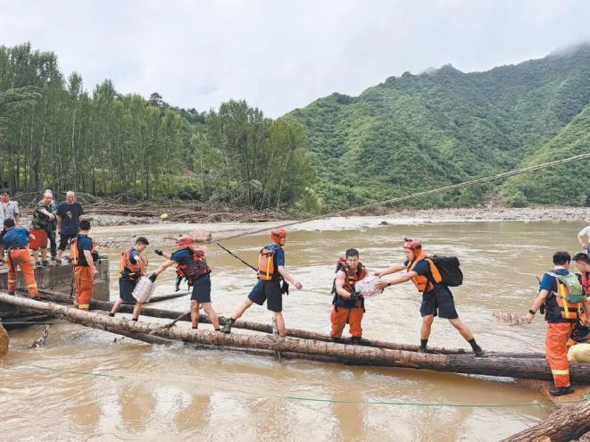消防救援人員在簡(jiǎn)易橋上轉(zhuǎn)移物資運(yùn)往琉璃廟鎮(zhèn)碾子灣村。(來(lái)源:北京日?qǐng)?bào))
