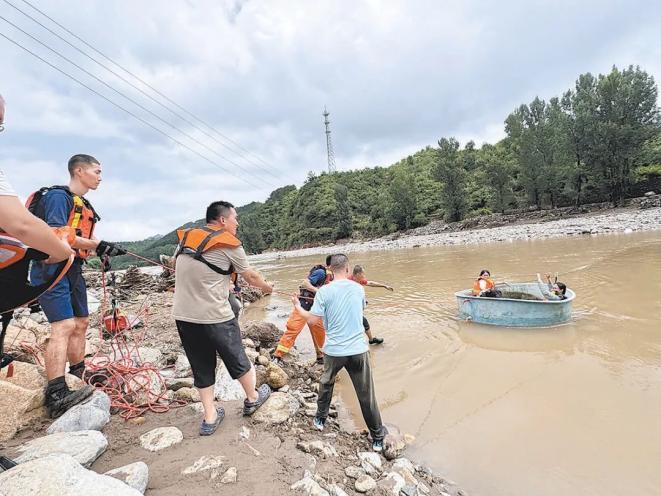 在碾子灣村的一片民宿區(qū),消防救援人員協(xié)助游客渡河。(來(lái)源:北京日?qǐng)?bào))