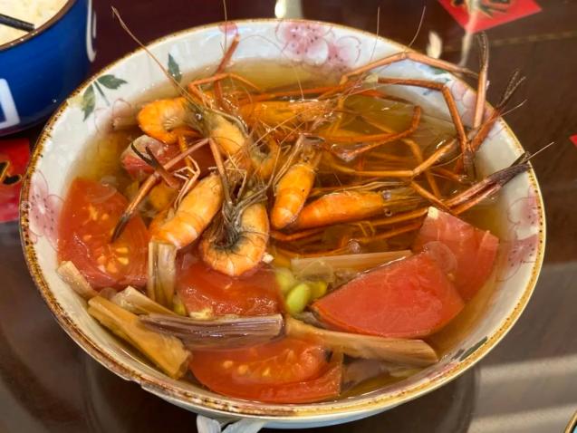 別看名字土里土氣,它可是蕭山人公認(rèn)的夏季“神仙湯”。配料隨你加,葫蘆、絲瓜、毛豆、番茄……無論放什么,菜蒲頭的咸香打底,時蔬的鮮味疊加,總能鮮出層次。要是遇上“豪華版”,湯里加了毛豆和河蝦,那鮮味更是讓人喝不夠。連湯帶料澆在熱飯上,“美”得能多吃三碗飯!
