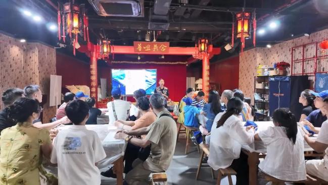 游完蘇河,團隊走進上海紡織博物館。在非遺扎染體驗區(qū),素白棉布被折疊、纏繞、捆扎,空氣中彌漫著靛藍染料的獨特氣息。大家饒有興致地學(xué)習(xí)古老技藝,小心地將布匹浸入染缸。