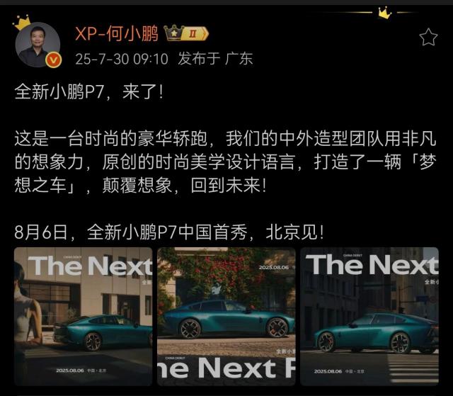反觀小鵬,過去一周的焦點是全新P7。何小鵬在個人社交平臺不遺余力地為這款顏值至上的純電轎跑宣傳。
