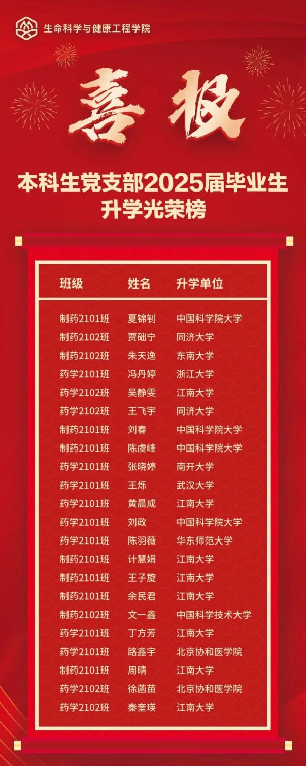 在今年畢業(yè)季,江南大學(xué)生命科學(xué)與健康工程學(xué)院本科生黨支部傳來(lái)喜訊:22名畢業(yè)生黨員成功升學(xué)深造。其中,8人被985高校錄取,8人被211高校錄取,6人分別被中國(guó)科學(xué)院大學(xué)、中國(guó)醫(yī)學(xué)科學(xué)院北京協(xié)和醫(yī)學(xué)院錄取。