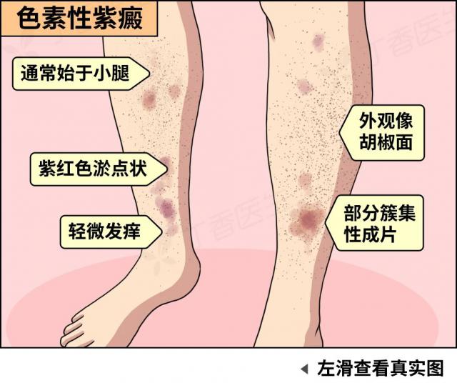 色素性紫癜從外觀上看,它的紅色淤點會融合成片,向外擴(kuò)展,可能會輕微發(fā)癢,對健康的影響也不大,具體可以去醫(yī)院進(jìn)一步評估。