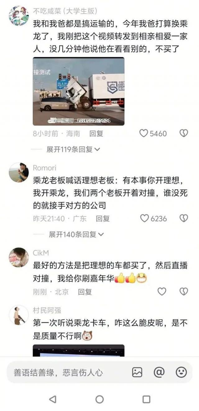 互聯(lián)網(wǎng)是有記憶的,很快,乘龍卡車的抖音評論區(qū)就變成了大型退貨現(xiàn)場和許愿池。一些自稱公司董事長的網(wǎng)友紛紛表示,原本打算采購乘龍卡車,看完視頻后決定換牌子,還說“惹不起惹不起”。這些“董事長”們的意向訂單少則一百臺,多則兩萬臺,把評論區(qū)刷出了小米 SU7 三分鐘破 20 萬臺的氣勢。如果這些訂單都是真的,理想這一撞,直接讓乘龍卡車損失巨大。