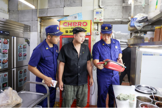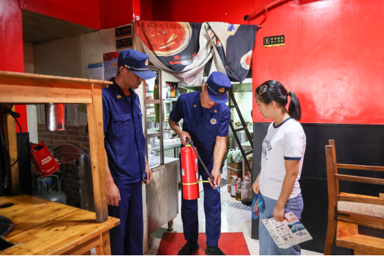 在一家餐飲店,消防員發(fā)現(xiàn)后廚的滅火器壓力不足,即將過(guò)期。消防員指著滅火器,向店員說(shuō)明隱患危害,并現(xiàn)場(chǎng)演示按壓、噴射等操作要領(lǐng),直到店員熟練掌握才放心離開(kāi)。檢查過(guò)程中,消防員們逐店查看消防設(shè)施、疏散通道、用電用氣等情況,對(duì)發(fā)現(xiàn)的問(wèn)題進(jìn)行“點(diǎn)對(duì)點(diǎn)”提醒整改。