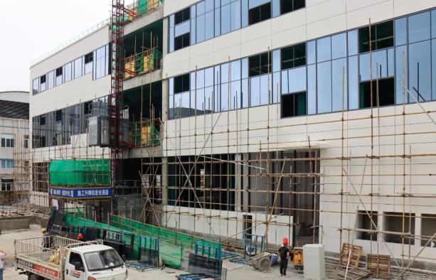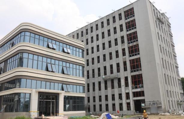 從空中俯瞰,主體為白色的多層建筑十分惹眼。簡(jiǎn)潔的白色墻體搭配著大面積玻璃幕墻,盡顯現(xiàn)代時(shí)尚之感。目前,建筑外腳手架還未完全拆除,周邊整齊堆放著施工材料,吊車等機(jī)械設(shè)備在有序作業(yè),施工人員忙碌穿梭其間。