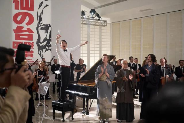 他對父親仍有批判性,諷刺郎國任的傲慢,也質(zhì)疑其對個體自由的壓迫。但問題恰恰在于,這種批判并未完成徹底的推翻或重構(gòu)——一邊拆解父親的專斷,一邊又在情感上維護這種控制背后的愛;一邊在敘事層面構(gòu)建反抗,一邊又在戲劇結(jié)構(gòu)中安排理解與回歸。例如,結(jié)尾的一場父子決裂——因兒子郎朗拒絕他的指令,郎國任憤怒離場。情節(jié)看似要反思父與子之間復(fù)雜的角力,但沒過幾分鐘,郎朗在演出前遇到困難,郎國任天降般出現(xiàn),再次幫了郎朗一把。最后,卡內(nèi)基音樂廳外,郎國任乘直升機離去,從高空俯瞰“一戰(zhàn)成名”的兒子。