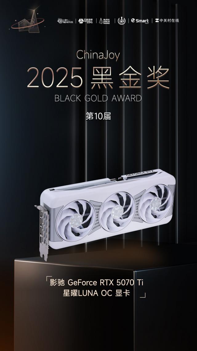 憑借在顏值、性能等方面的絕對(duì)優(yōu)勢(shì),在當(dāng)天公布的第十屆 ChinaJoy 黑金獎(jiǎng)中,影馳 GeForce RTX 5070 Ti 星曜 LUNA OC 一舉拿下 2025 黑金獎(jiǎng),用實(shí)力證明了自身的優(yōu)秀。
