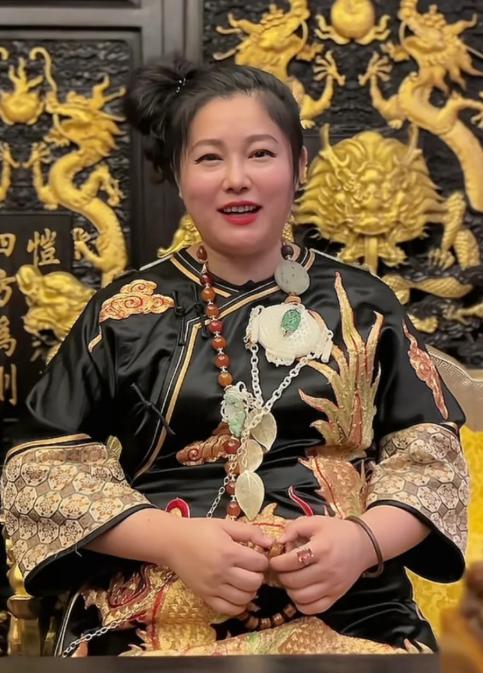 視頻中她身穿中式旗袍,戴滿串珠,手上還盤(pán)著串,看起來(lái)很富態(tài)。