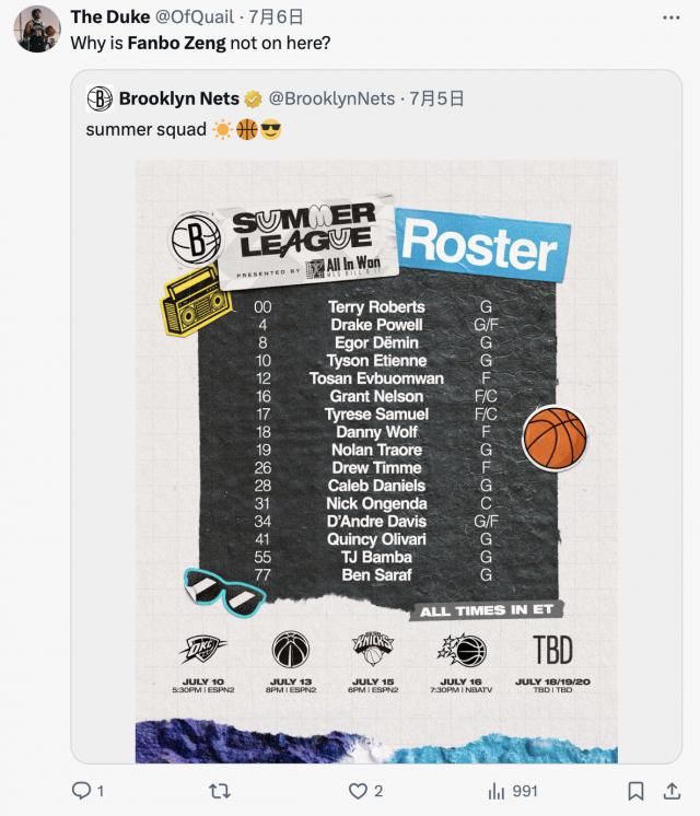 之前籃網(wǎng)公布夏賽名單時(shí),有美國(guó)網(wǎng)友問(wèn)為啥沒(méi)有曾凡博,這球迷真是有先見(jiàn)之明!
