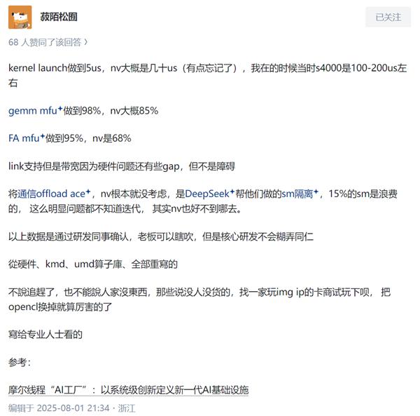 他認(rèn)為,摩爾線程的GPU從硬件、kmd、umd算子庫(kù)全部進(jìn)行了重寫,有力回?fù)袅四切┱J(rèn)為摩爾線程沒有核心技術(shù)的觀點(diǎn)。