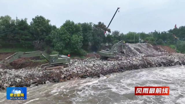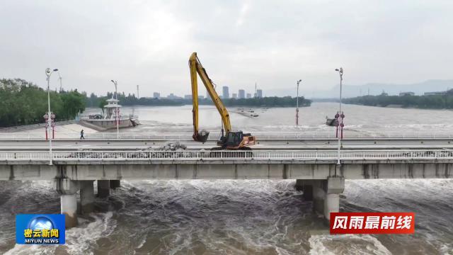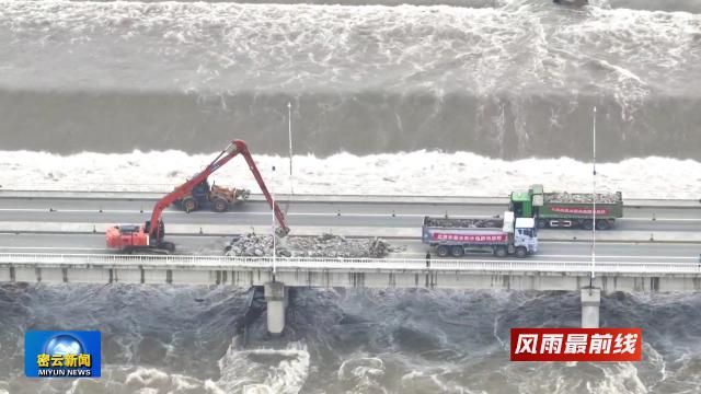 潮匯大橋是潮白河水系的“咽喉”和城區(qū)交通樞紐,在泄洪期承擔(dān)著關(guān)鍵的水文監(jiān)測與安全管控職能,是密云區(qū)防洪體系中不可或缺的一環(huán)。在施工現(xiàn)場,搶險隊爭分奪秒與洪水賽跑,鉤機(jī)、運(yùn)輸車等大型機(jī)械高效調(diào)度,作業(yè)有序。