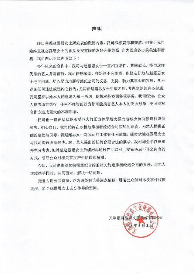 “銀河酷娛”最后稱,會繼續(xù)與藝人攜手共進(jìn),懇求公眾不要過度關(guān)注,給趙露思充分的休養(yǎng)時(shí)間。