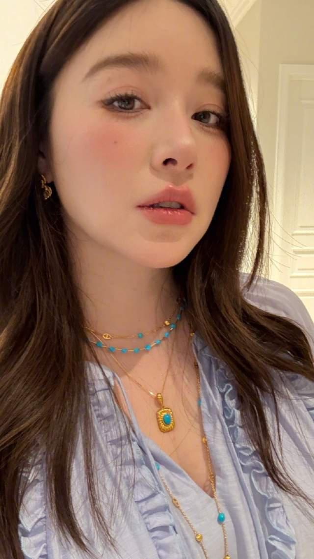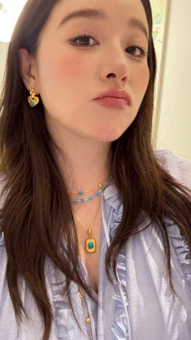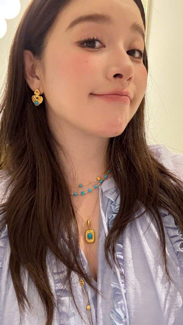 身穿藍(lán)色上衣的闞清子,還佩戴了一套價(jià)值不菲的綠松石首飾,整個(gè)人美麗溫柔又大氣,更具女人味,散發(fā)著迷人的光芒。