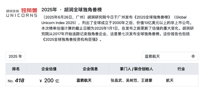 跨界者的優(yōu)勢在于沒有思維定式的束縛。張昌武的金融背景反而成了破局的關(guān)鍵,他熟悉資本運作規(guī)律,在創(chuàng)業(yè)初期就系統(tǒng)規(guī)劃了技術(shù)路線與融資節(jié)奏的匹配性。目前,公司已累計獲得超70億元融資,背后不僅有紅杉資本、碧桂園創(chuàng)投、經(jīng)緯中國等頭部機構(gòu),也有國家制造業(yè)轉(zhuǎn)型升級基金這樣的“國家隊”深度參與,豪擲9億元創(chuàng)下單筆最大投資記錄,凸顯國家隊對商業(yè)航天硬核實力的認可。如今的藍箭航天,估值已從早期的幾億元增長到200億元,背后是其技術(shù)壁壘與市場潛力的雙重體現(xiàn)。胡潤研究院的《2025全球獨角獸榜》顯示,藍箭航天位列第418位,估值與SpaceX早期階段相當。