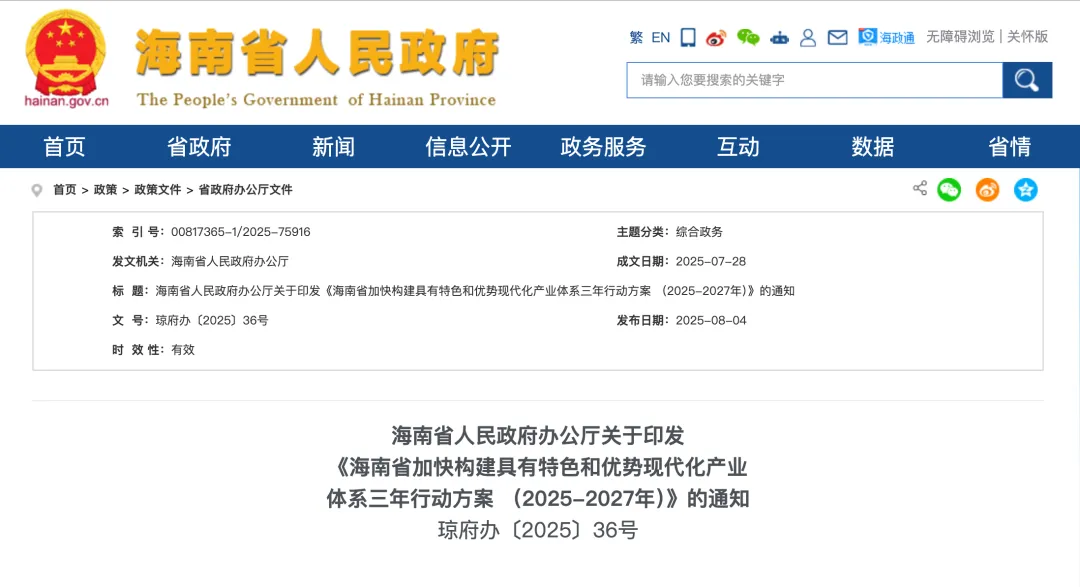 《海南省加快構(gòu)建具有特色和優(yōu)勢(shì)現(xiàn)代化產(chǎn)業(yè)體系三年行動(dòng)方案(2025-2027年)》已經(jīng)省委、省政府同意,現(xiàn)印發(fā)給你們,請(qǐng)認(rèn)真貫徹執(zhí)行。